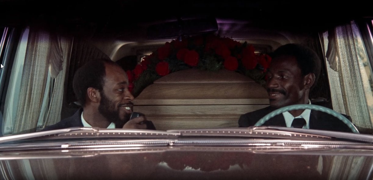 The first scenes filmed were the Hearse rounding the corner as Trans Am #1 comes flying in to cut in front of the procession. The Trans Am comes in so hard it lifts the left rear tire off the ground.