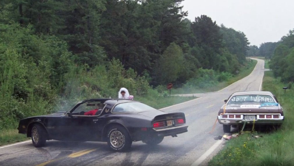 The pickup scene was filmed on Mundys Mill Road in Jonesboro, GA. Google Street View The stunt where the Trans Am slides to a stop in front of Carrie was performed by stunt doubles; Alan Gibbs and Janet Brady. The Trans Am used here for exterior shots we refer to as Trans Am #2. As Burt is driving this car away we can see it chirps second gear and the rear sway bar raises and drops when it shifts into 2nd gear. This leads many to believe that this car has a manual transmission, a 4-speed. The road that you see the brown van emerge leads to a clearing in front of Mundys Mill. That is where the filming crew was setup. It explains why so many scenes were filmed in this general area. It was too convenient.
